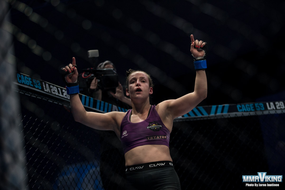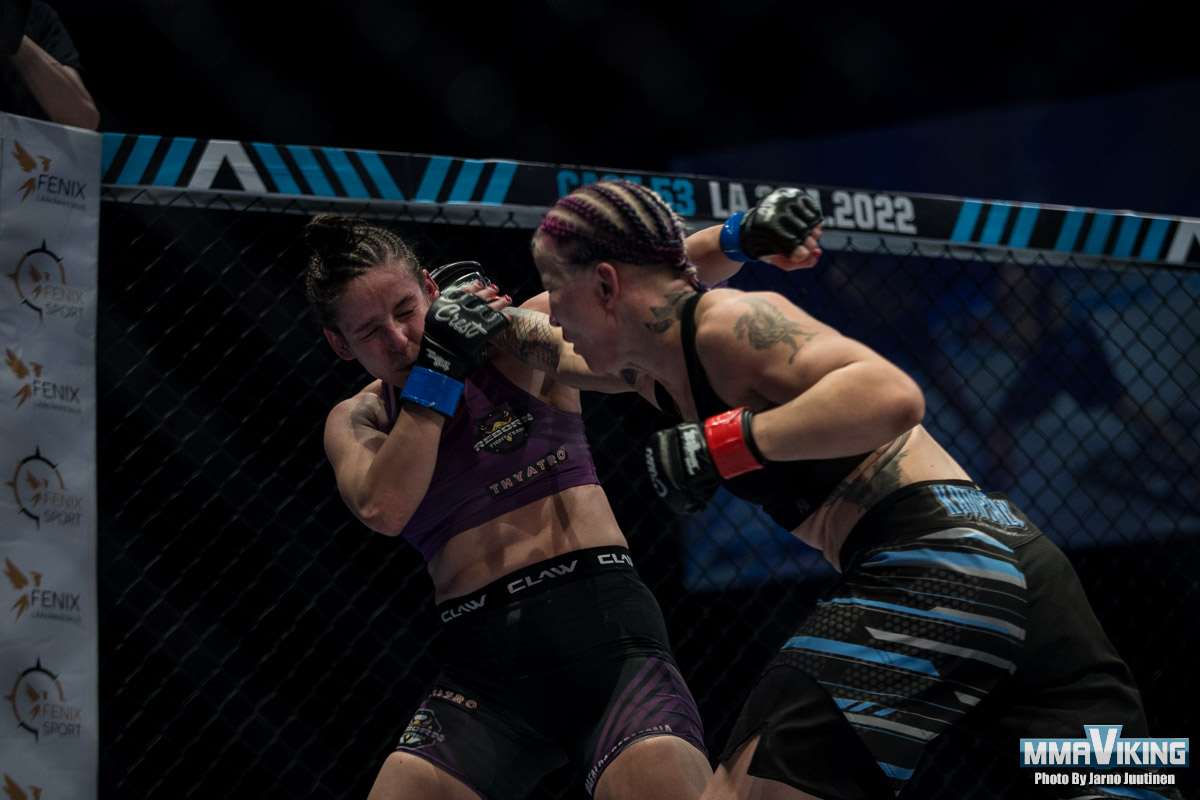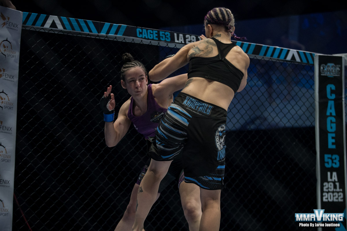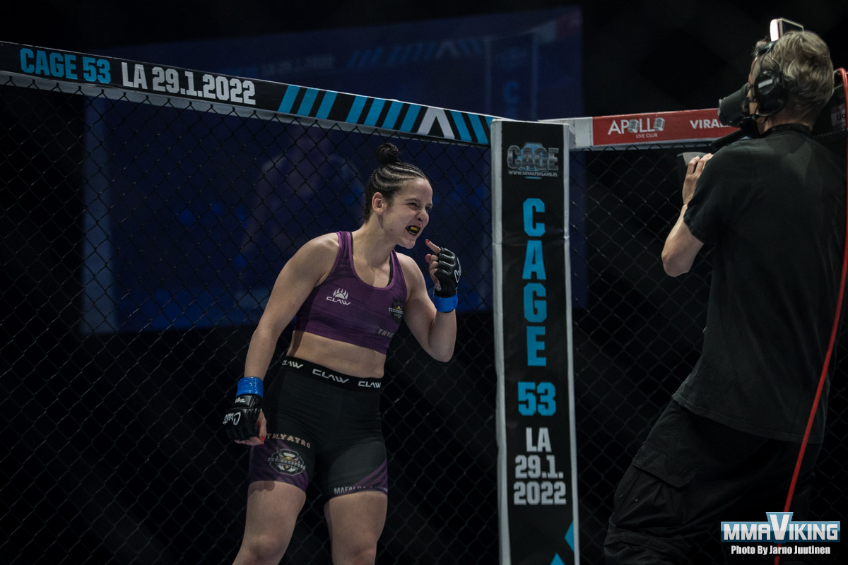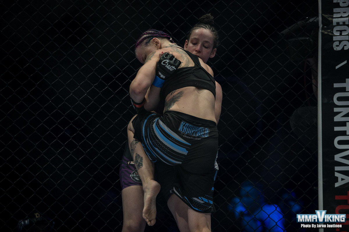 Team East Front’s Suvi Salmimies (12-5-1) took yet another W regardless of eye injury after epic 15 minute battle againts skilled Portuguese Mafalda Carmona (3-0) of Reborn Fight Team at Cage 52. Photographer Jarno Juutinen was cageside to capture the main fight of the evening.
