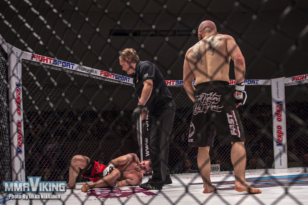 Finnish leglock specialist did was he is known for as he attacked with four or five different leg lock attempts with just a few minutes in to the first round. Michailidis seemed unfazed with these attacks. Unfortunately as he scrambled out of a leg lock his knee gave out and he could not continue. MmaViking’s photographer iikka Nikkinen was cageside at Cage 28 in Helsinki, Finland.