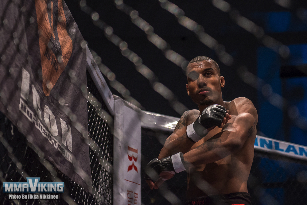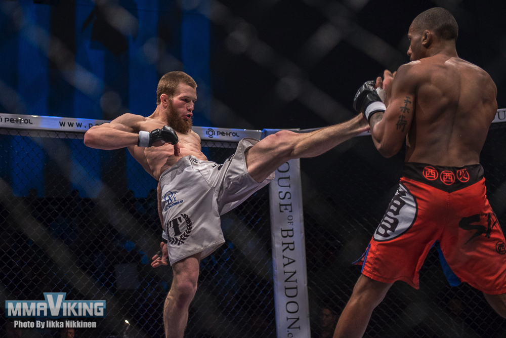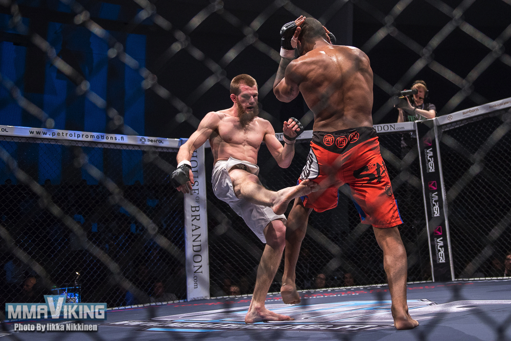 Niko Myllynen vs. Kevin Ruart was the second bout of the evening and it continued with the same tempo as Saku Heikkola’s fight. Myllynen found a home for leg kicks after a few minutes of intense fighting, he even threw a few spinning back fists in the fight. Myllynen came out to the second round swinging and he punched his way into a TKO in the second round. MMAViking.com’s photographer iikka Nikkinen captured these moments during the fight.