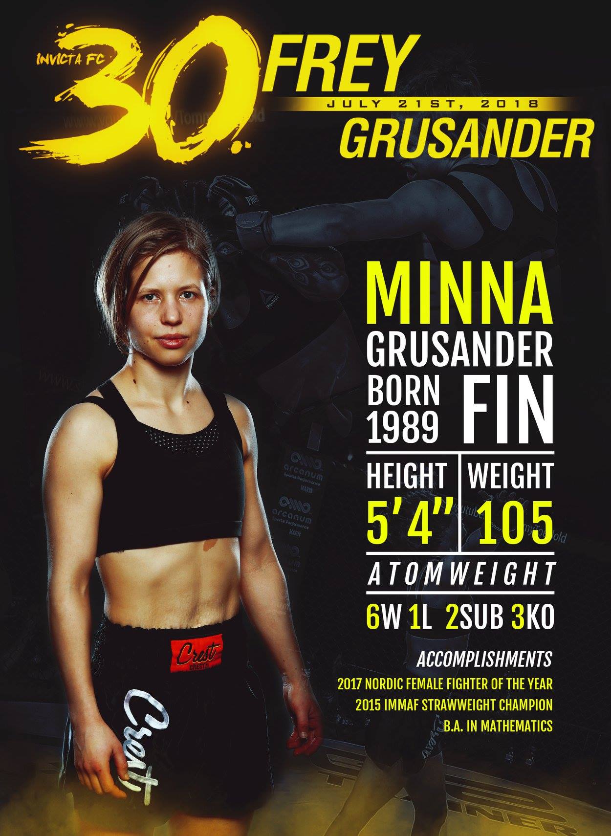 Minna Grusander (6-1-0) will fight for the vacant atomweight title against Jinh Yu Frey (6-3-0) tomorrow night at Invicta FC 30 in Kansas City. It is an opportunity for “Brutsku” to become the first fighter to win both an IMMAF and Invicta championship and just the second Nordic fighter to capture the belt behind Finn Katja KankaanpÀÀ that won the strawweight strap back in 2014.