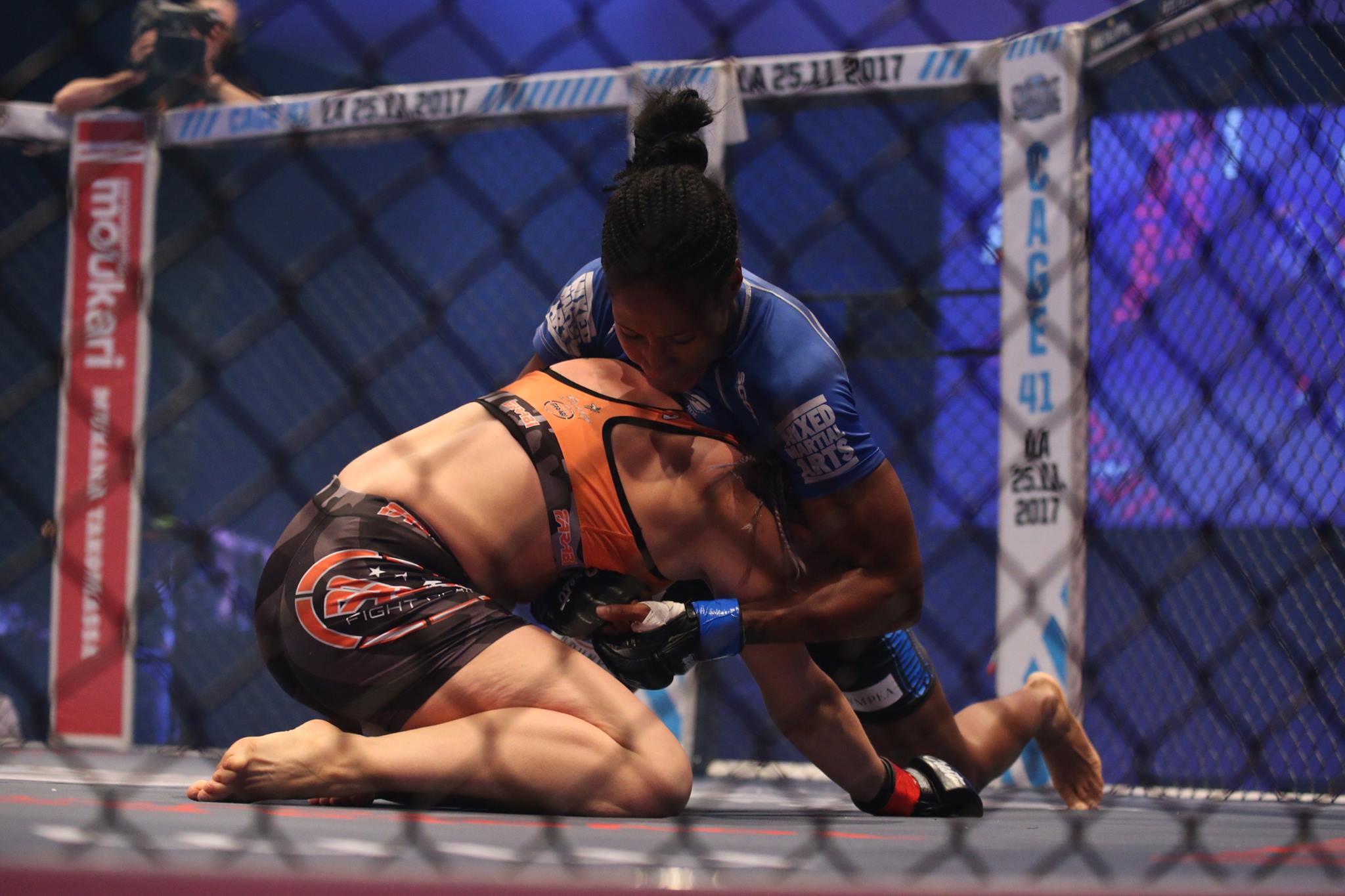 Dos Santos keeping Salmimies well in her preferred range, but soon Salmimies initiates the clinch. Dos Santos turns Salmimies against the cage, but she soon reverses the situation. Salmimies with good knees to the body. Dos Santos seems to be slowing down a bit, Salmimies pushes her against the cage again, but is the target of a knee to the groin.