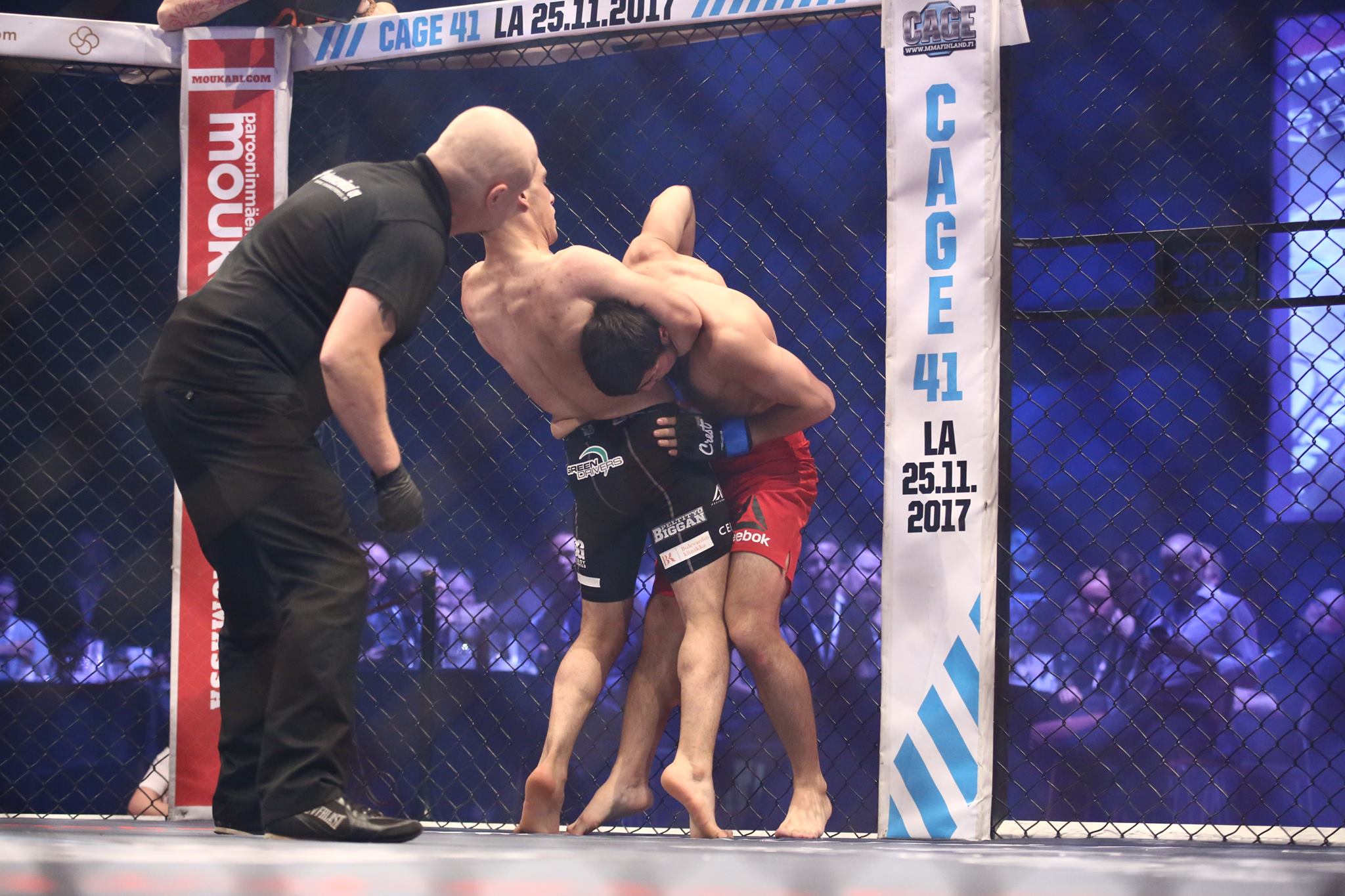 Fighters hug each other as the last round starts. Nyyssönen lands two hard strikes, Pietilä shoots for a take down. Enter the clinch.