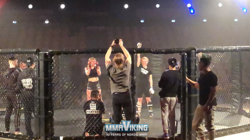 The quickness of Elin is showing early in the second, and the left hand is like lightning. Österberg’s face is messed up, and the Swede is dropping her with punches. The doctor steps in to look at the face of the Finn, with the left eye just swollen shut. This fight is called off. All over and win for Elin against the game Anette.