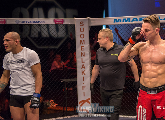 The bout was declared as a win by majority decision for the Finn when announced inside the cage. However, the result was immediately protested by the Sweden based team that saw a clear round one and three in favor of their Brazilian fighter. Β The overturned result was posted on the federations website and on Facebook late last night.