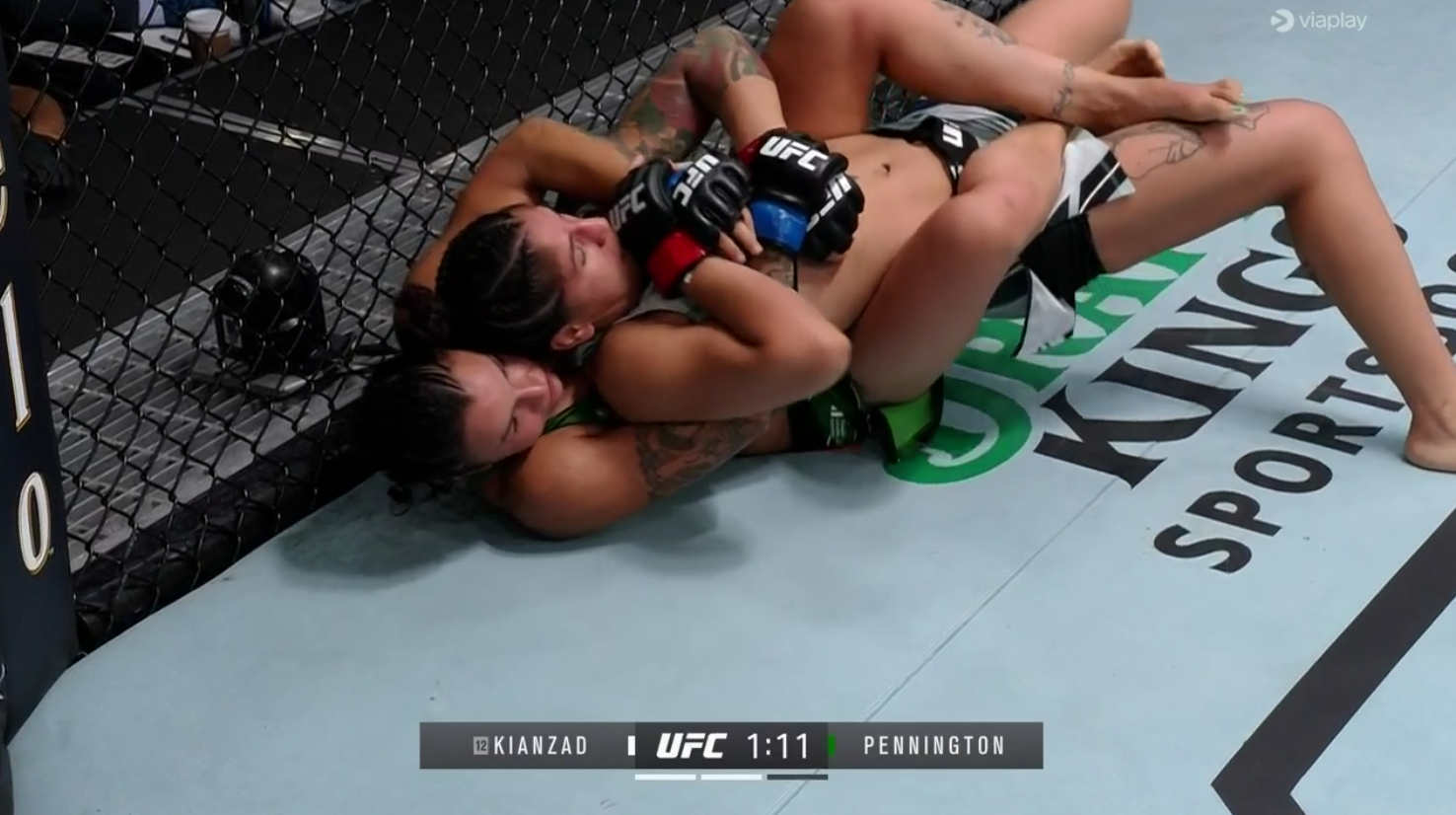 The Arte Suave fighter is hit with a superman punch to start the round, then both go to the clinch. Pennington lands some good shots, and Pannie takes a step back… pauses then throws some hard shots that land of her own! Pennington lands a good elbow and is pushing the action here, until Pannie lands a sweet three punch combination. A rare kick from Raquel lands. In the clinch, the Swede defends by putting a leg up, but the American takes it and finishes a take-down. Kianzad goes to work on the ground and looks for a triangle, but Pennington adjusts and takes back.