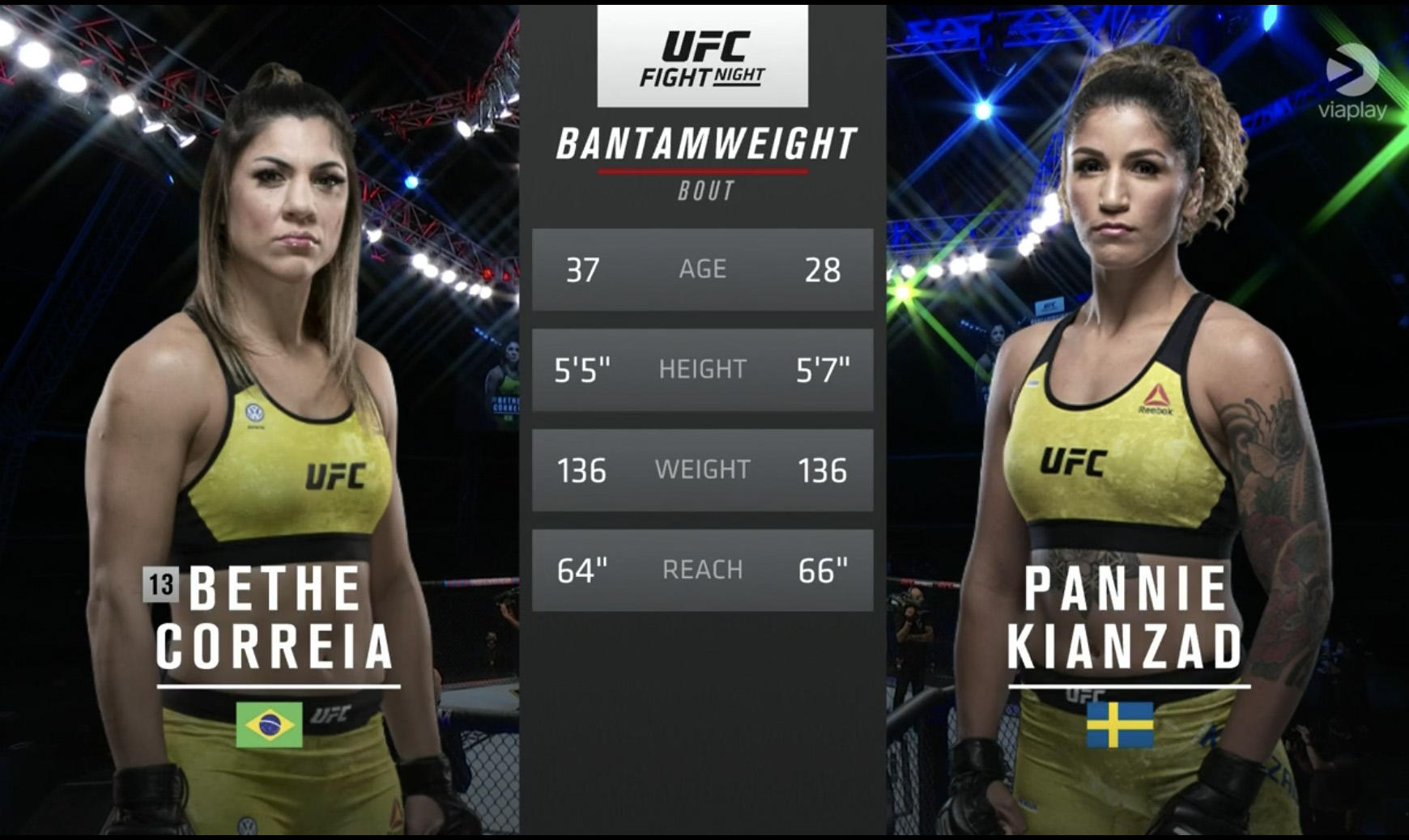 Pannie landed good right hands to start the fight. Correia tried for a take-down as she is getting outstruck, but the Swede defends. Good clinch work from Pannie that is light on her feet. Another right hand from Kianzad that is the faster fighter. Spinning backfist, and this is all Kianzad as Bethe. Correia goes for a high-five with 10 seconds to go hearing the clap, and Pannie just rips a right hand to the face, and another.
