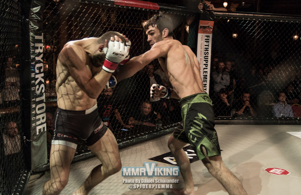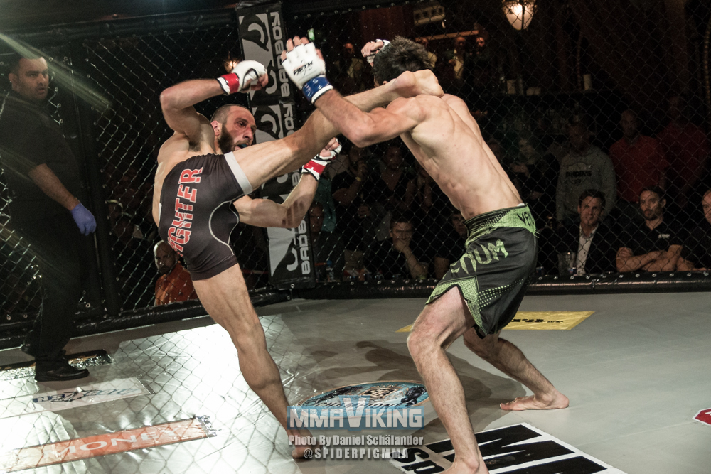 Two old training partners from Georgia ended up facing in their adopted home country of Sweden, as Guram Kutateladze ended up finishing the fight with brutal knees to the face Gocha Smoyan at IRFA 10 last night in Stockholm.  The Redline fighter has now won four straight bouts.  MMAViking.com photographer Daniel Schälander was cageside at Berns to capture the TKO.
