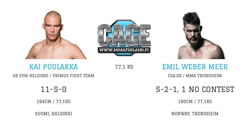 Cage 32 continues to add quality Nordic battles to their upcoming card. Today, the promotion announced that Finn Kai Puolakka (11-5) will face Norwegian Emil Weber Meek (5-2-1, 1 NC) on October 23 in Helsinki.