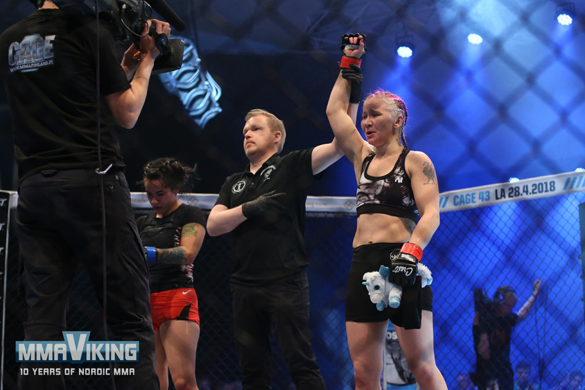 Suvi Salmimies (8-5-1) beat Argentina’s PΓ‘mela Aguirre (5-3) Saturday night at CAGE 42 in Helsinki in impressive fashion. “I felt really good and emotional” says the Finn to MMA Viking after the big win.