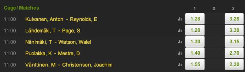 MMAViking.com’s main sponsor Unibet has odds available for all the fights including Saturday’s Cage 23 in Finland and UFC 165 ‘Jones vs. Gustafsson’ and next Thursday’s European MMA card in Denmark. ย Gustafsson is seen as the biggest underdog as he seeks a UFC title, while Nicholas Dalby is a favorite overย Morten Djursaa in the headliner Dane-versus-Dane battle, and the Finns are all favored on the main card.