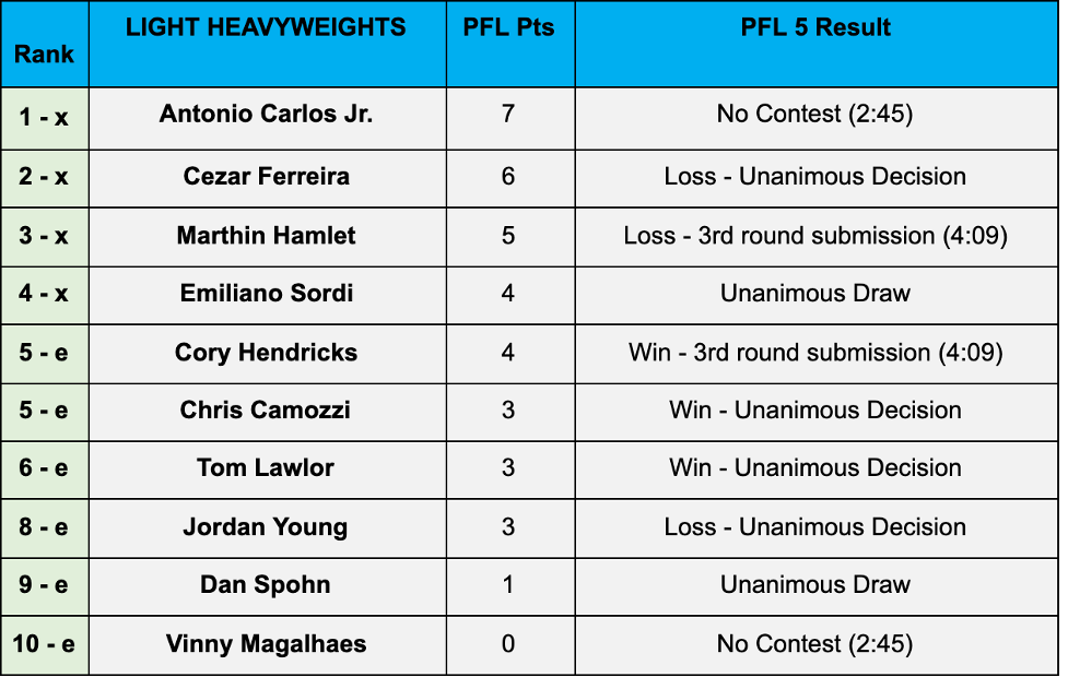 Hamlet enjoyed a 128-20 advantage in total strikes landed heading into the third round.Β However, Cory Hendricks defeated Hamlet by third round submission (4:09) in last night’s action, however the Norwegian advanced in the playoffs since Chris Camozza earned a unanimous decision victory giving him only three points. Since Camozzi did not secure a finish, he was eliminated from playoff contention. As a result Marthin Hamlet has earned a playoff spot.Β The 2021 Semifinal matchups in the light heavyweight division will see the top-seeded Carlos Jr. against 2019 champion Sordi, and Ferreira versus Hamlet.