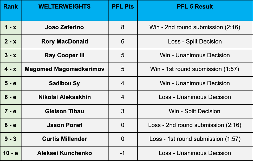 To kick off the ESPN+ card, Sadibou Sy and Aleksei Kunchenko went the distance in a welterweight matchup. Sy was awarded the victory by unanimous decision, pushing his season total to four points.Β Even with the win however, the Swede will not advance to the playoffs based on the point total, and the 2021 Semifinal matchups in the welterweight division will see the top-seeded Zeferino against Magomedkerimov, and MacDonald matched up with Cooper III.