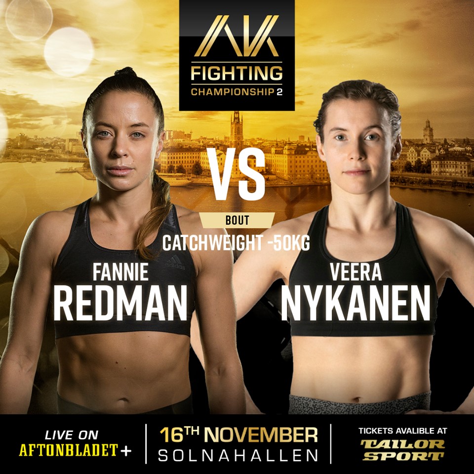 Finn Veera Nykänen (2-2) and Swede Fannie Redman (1-1) will fight in Stockholm at AK Fighting Championship 2 going down on November 16.