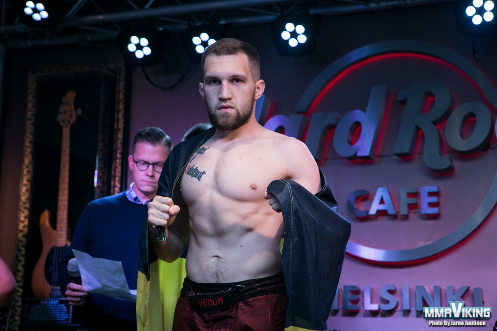 CAGE 40 goes down tomorrow at the Helsinki Culture House. MMAViking.com contributor Jarno Juutinen was cageside to capture the weigh-ins at the Hard Rock Cafe. Headliner Joni Salovaara was presented with his late replacement opponent, and Patrik Pietilä was a no show as he focused on getting recovered and ready for tomorrow.